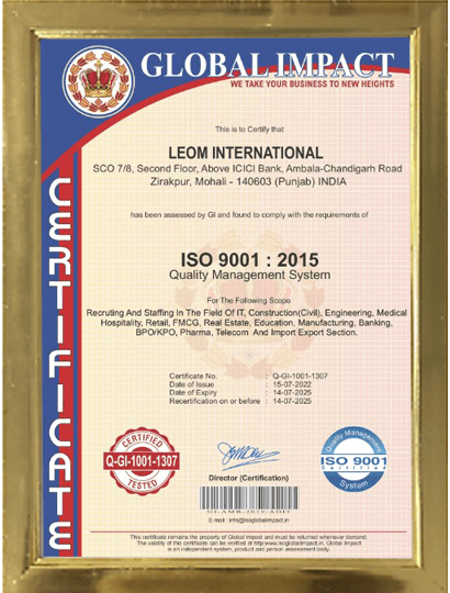 Leom International is a leading ISO 9001:2015 certified recruitment agency based in Zirakpur, offering expert placement solutions for both IT and Non-IT sectors. With years of experience in the hiring industry, we specialize in connecting top talent with reputable companies across India and overseas. Our professional team of placement consultants works closely with employers to understand their specific staffing needs and delivers candidates who are skilled, reliable, and ready to contribute from day one.